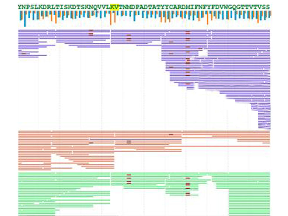 Data analysis: The mass spectra data are analyzed using de novo sequencing algorithms to acquire the sequence of each peptide, where Leucine (L) and Isoleucine (I) are differentiated by a couple of methods, such as enzyme preference and unique w ions. Then the overlapping peptide sequences are assembled into a complete antibody sequence.